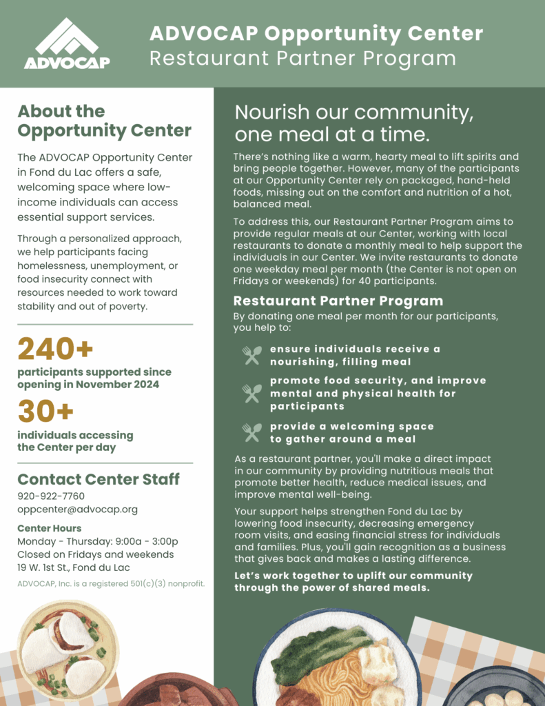 We’re reaching out to invite local restaurants to partner with us in a meaningful way: by donating one weekday meal per month for approximately 40 individuals at our Opportunity Center in Fond du Lac.