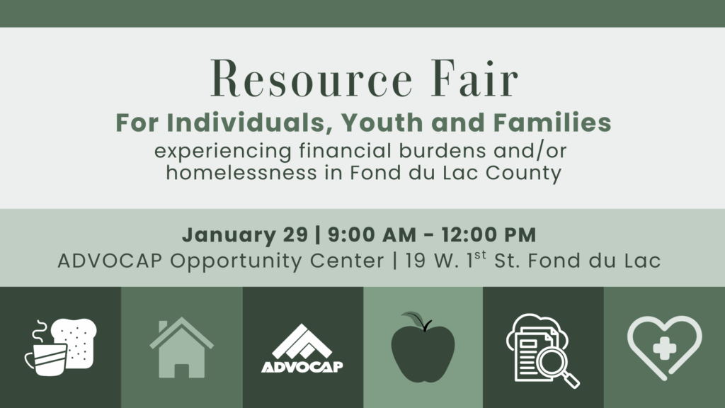 ADVOCAP is hosting a free Resource Fair for individuals, youth, and families in Fond du Lac County who are experiencing financial challenges and/or homelessness. This event brings together local organizations in one place to help connect community members with services and support, including: