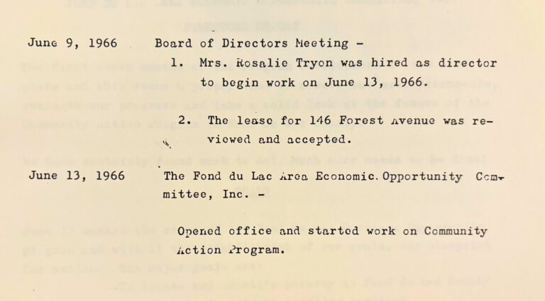 The organization held its first Board of Directors meeting in February of that year, officially beginning local leadership and community decision-making. A few months later, Rosalie Tryon was hired as the organization’s first Executive Director. In June 1966, the office opened, and work on the Community Action Program began in Fond du Lac, building early partnerships and collaboration with local organizations and community leaders to reach those most in need.