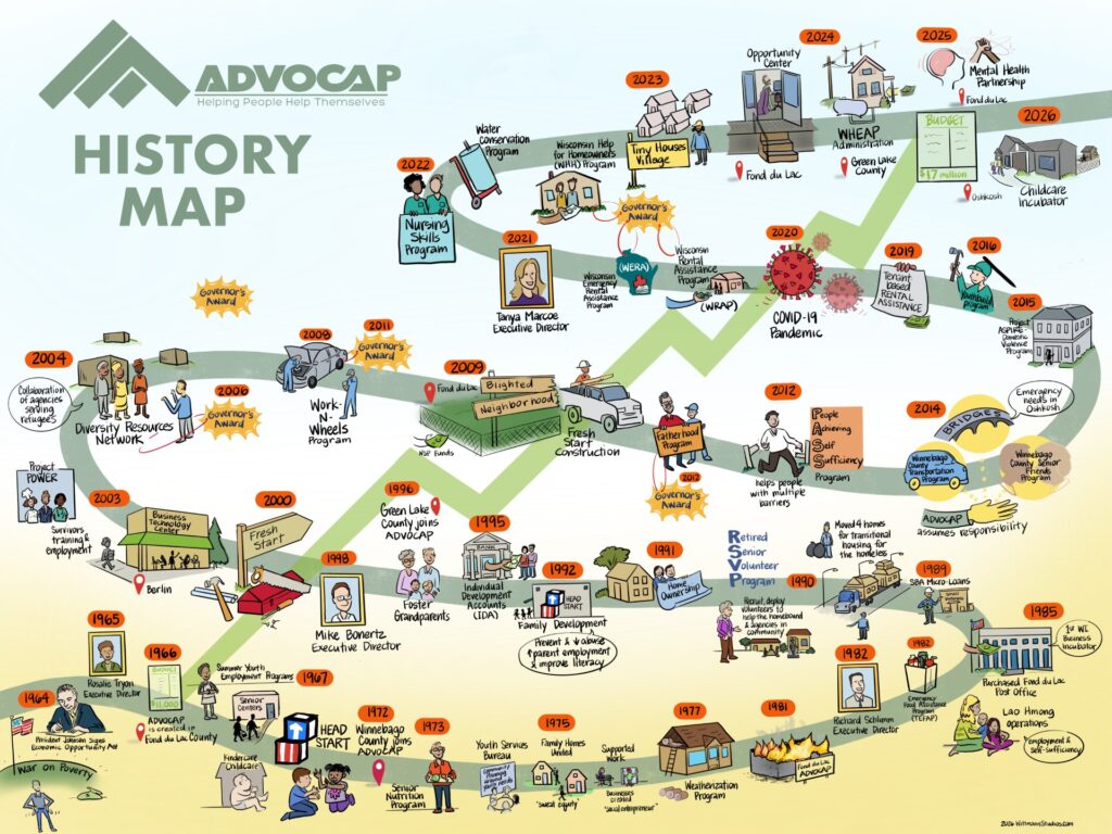 ADVOCAP was established in 1966 as part of the national Community Action Program (CAP), with a mission focused on creating opportunities and strengthening economic and social stability in the community. On January 12, 1966, the Articles of Incorporation were filed for what was then known as the Fond du Lac Area Economic Opportunity Committee, Inc.